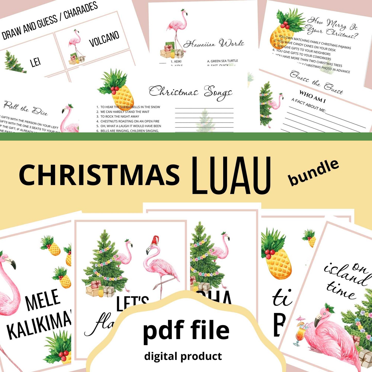 Christmas luau party signs and entertaining games make party planning a breeze.