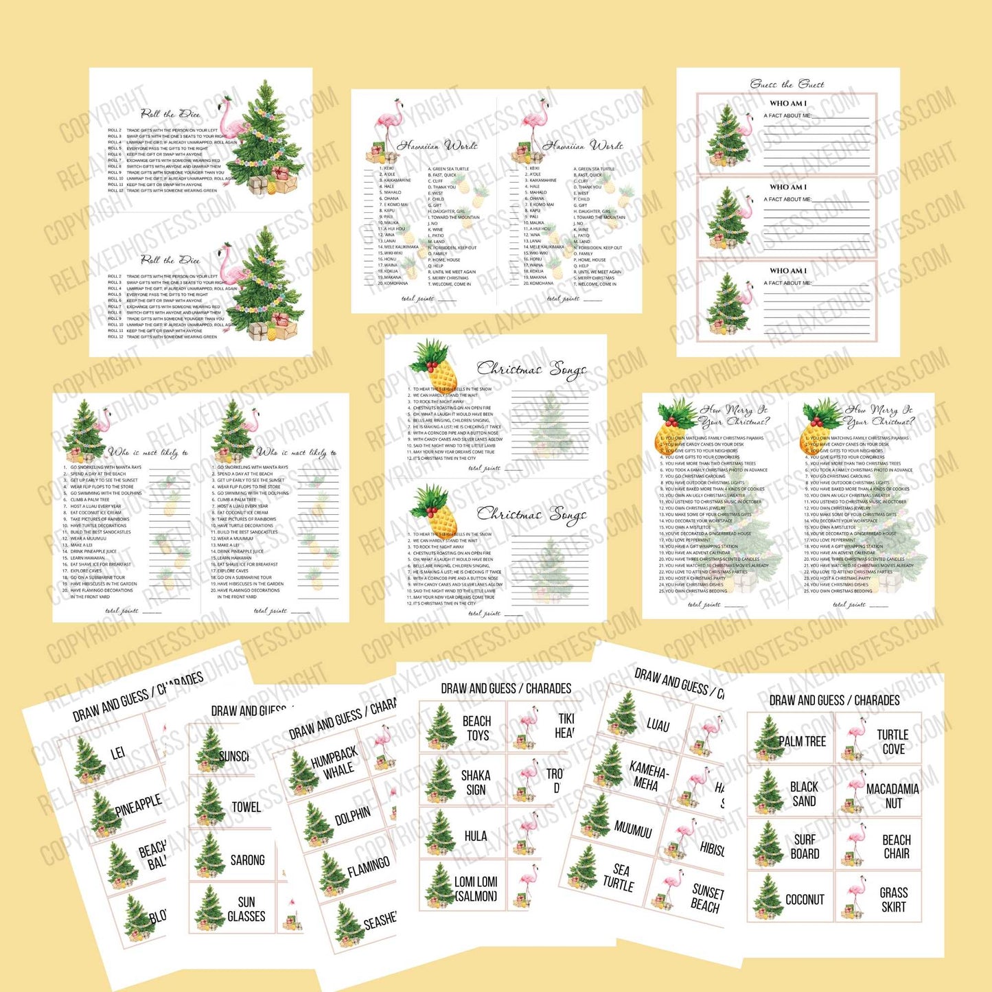 Festive designs combine pineapples, flamingos, and leis with Christmas trees, holly, and presents.