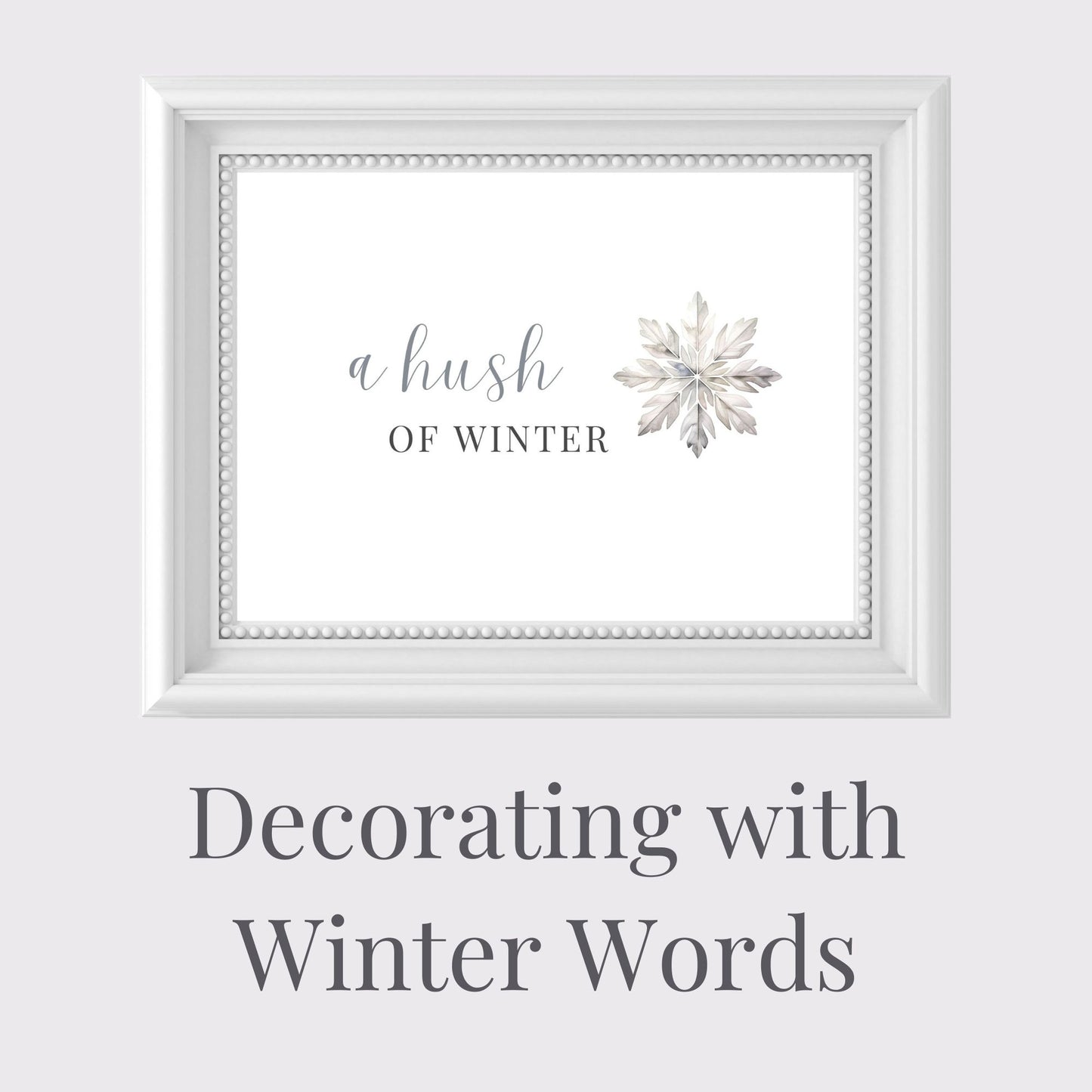 A poetic winter phrase with a single snowflake is beautiful by itself or as the anchor piece of your display. Subtle, serene, and intentionally spare. It's just right for sideboards or statement frames.